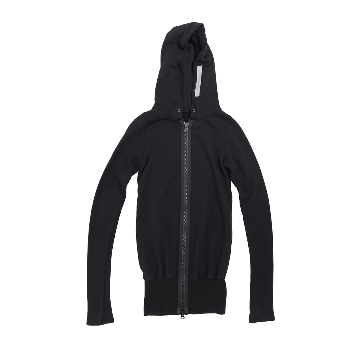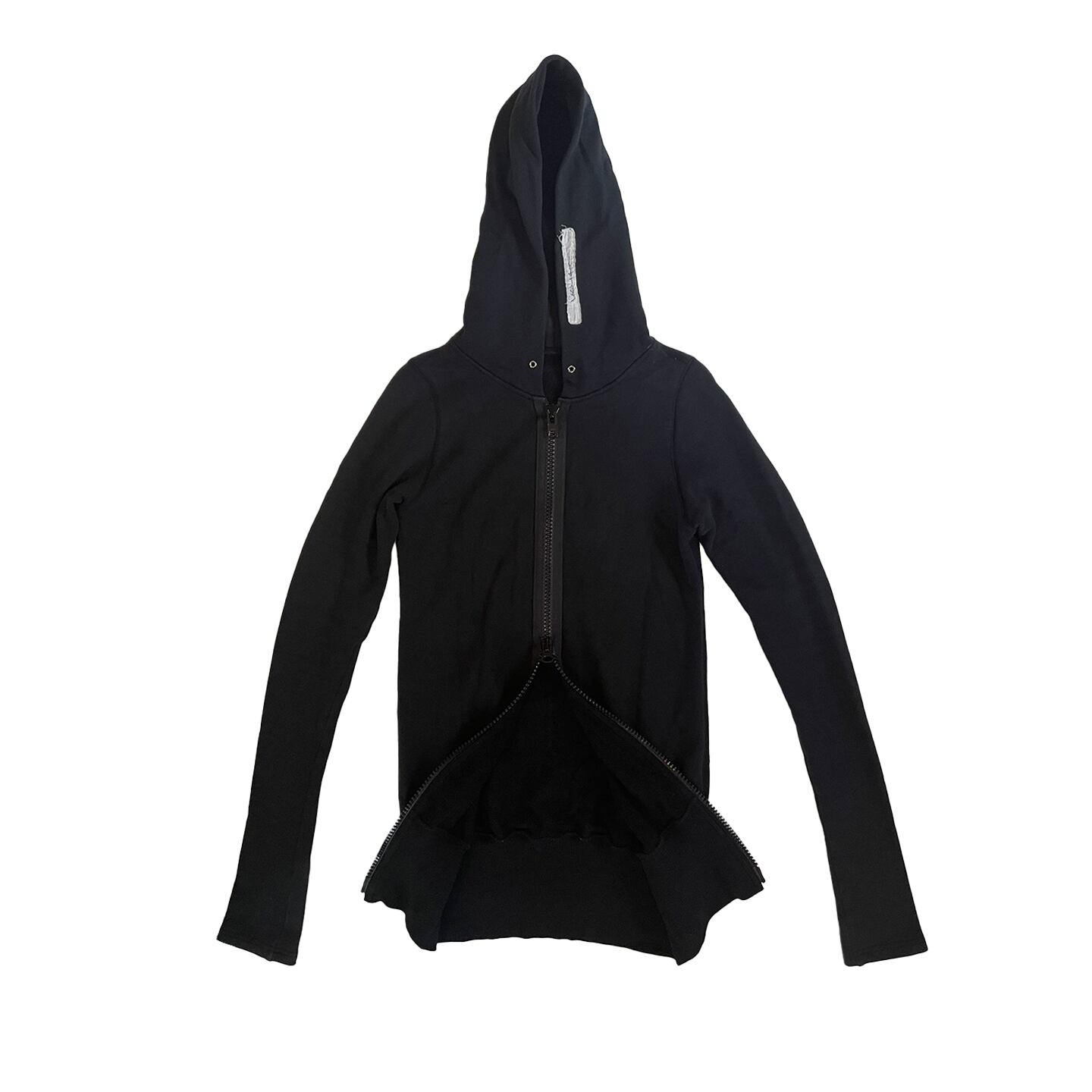 Beautiful cotton hoodie featuring a black front double zipper allowing to open it from the bottom. Extra long sleeves, tight ribbed bottom hem and brass details on the back. Fitted cut.