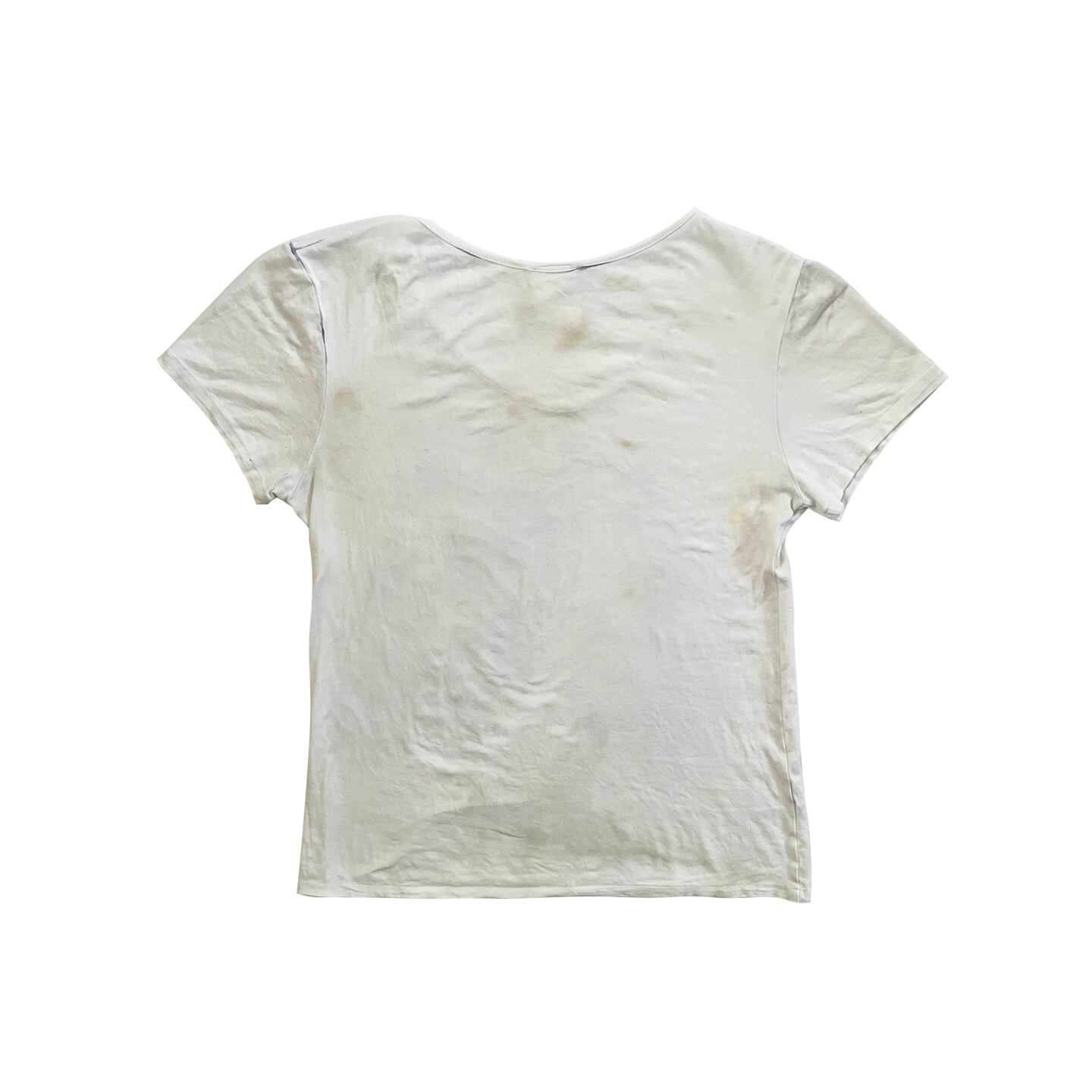 The shirt features a distinctive neck design, characterized by a deconstructed or asymmetrical silhouette to achieve a unique, contorted appearance.